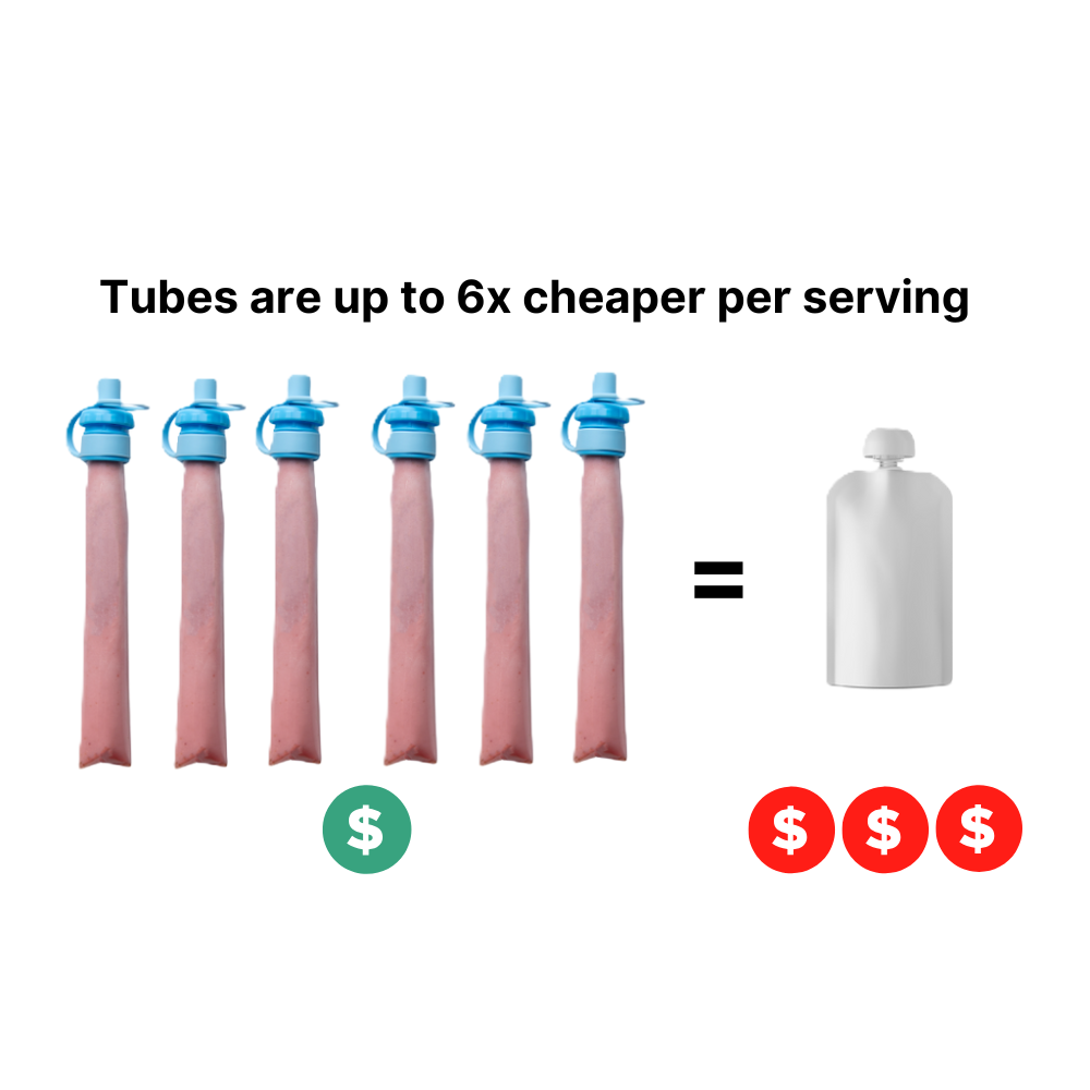 Yogurt tubes are relatively inexpensive, typically less than $0.30 per tube. However yogurt pouches can be $1.75 or more per pouch. Using a Tube Topper with a yogurt tube saves you money on snack time! The Tube Topper 2-pack pays for itself after as little as 12 yogurt tubes.